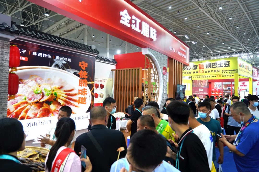 黄山全江腊味作为安徽黄山地标食材领军企业品牌,携团队近二十余人、携带几十种新品、爆品传统腊味食材再次亮相展会。如同往年的徽式布局,传统的徽派马头墙、一层层悬挂着的徽州刀板香、土香肠、酱肉和风干老鸡等产品,蒸笼里热气腾腾的醇厚腊香味,频频吸引客户驻足咨询。销售人员将产品的特色卖点娓娓道来、耐心讲解。用品质说话,让大家现场品鉴,用美味征服他们的味蕾。