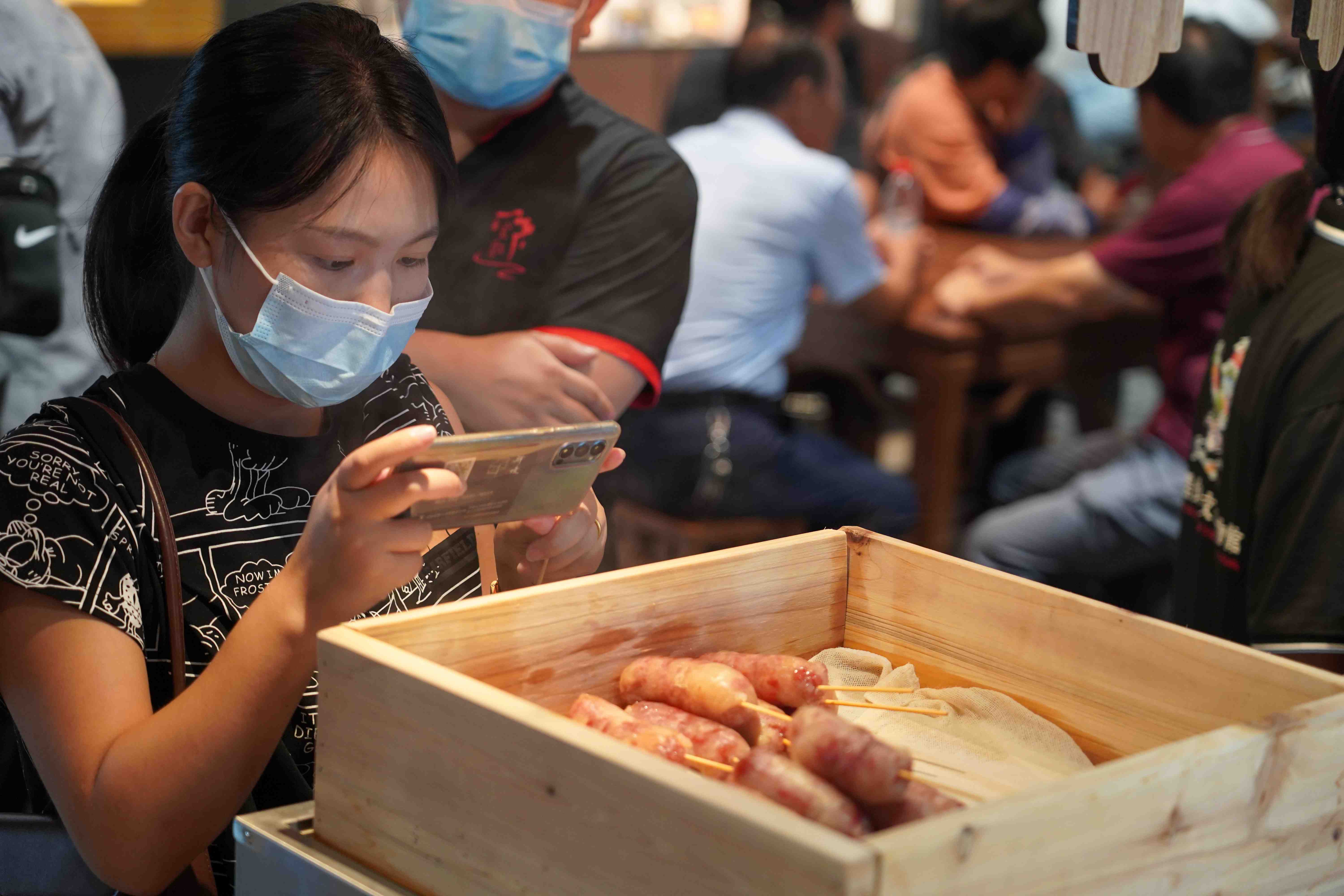 在人群中出现众多网红主播在全江腊味体验馆前直播,向直播粉丝介绍全江的传统徽州腊味,围绕皖南黑猪,聚焦徽州腊味背后的文化渊源,并向工作人员咨询直播带货的相关合作事宜。