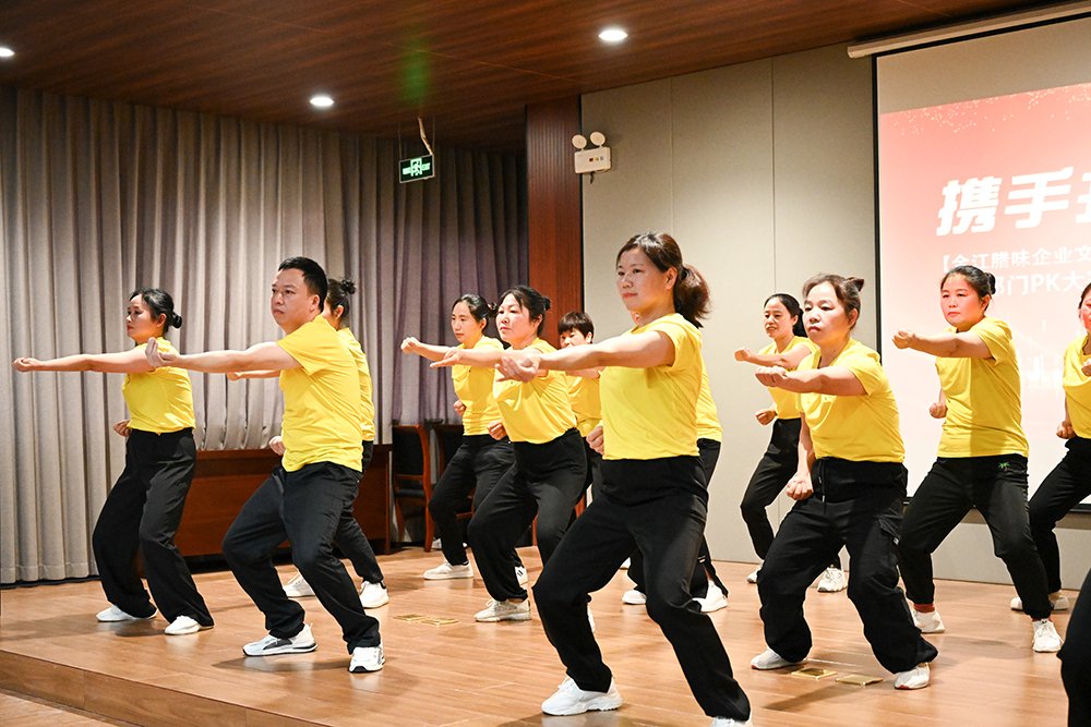 为宣传“六项精进”的企业文化思想,推行积极健康的工作生活方式,提升团队凝聚力,增强员工集体荣誉感与团队合作精神。4月22日,全江腊味在行政楼四楼活动室成功举办“全江腊味企业文化朗诵及八段锦部门PK大赛”,共有5个代表队近100名选手参赛。全江腊味董事长江礼明、总经理胡国峰、行政人事总监张雲、营销总监翟蓓、财务总监刘健、生产部经理翟玮、包装部经理钱桂枝、配料部经理汪胜利以及品管部主管包琦栋担任此次评委,其中全江腊味董事长江礼明作动员讲话。