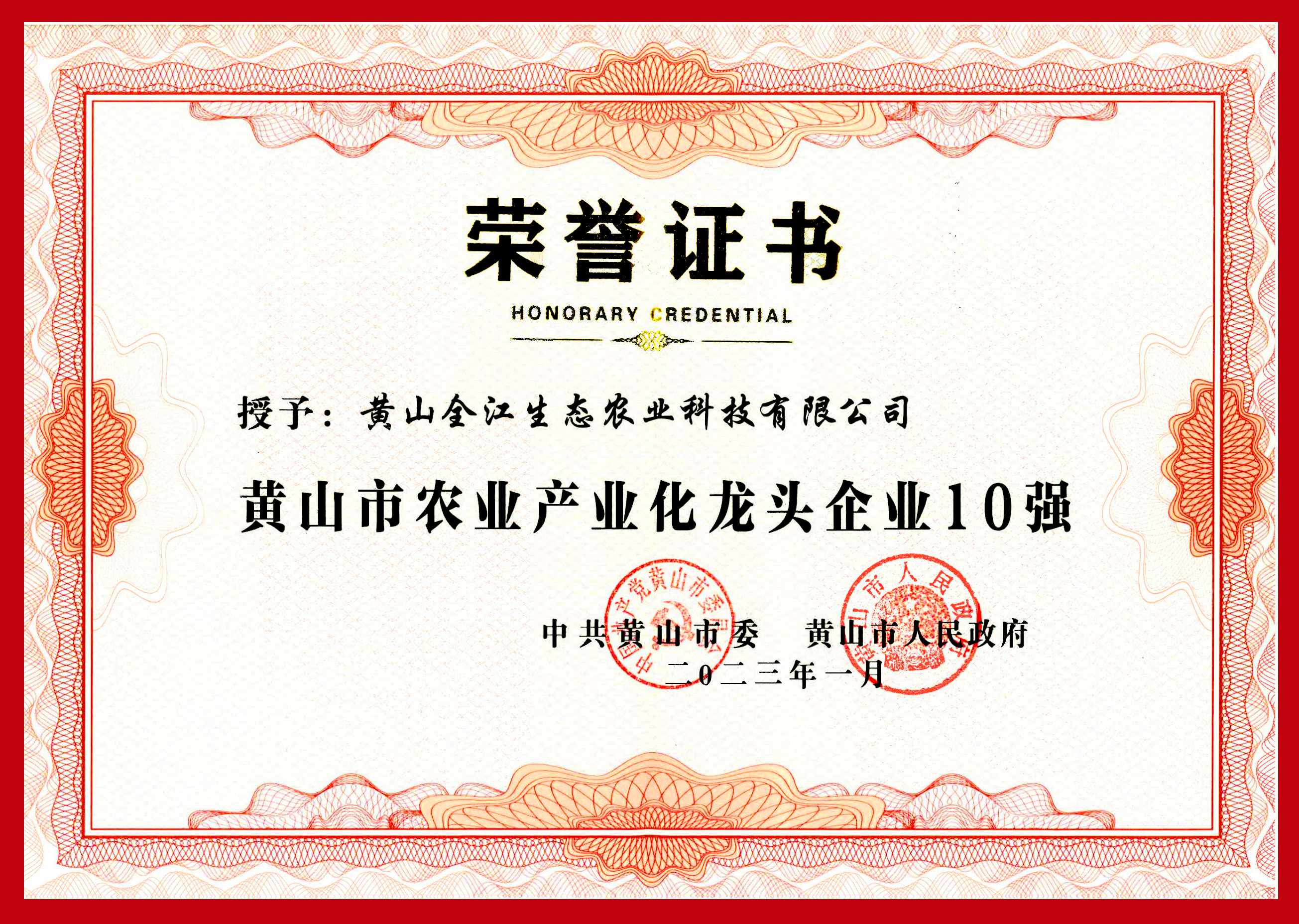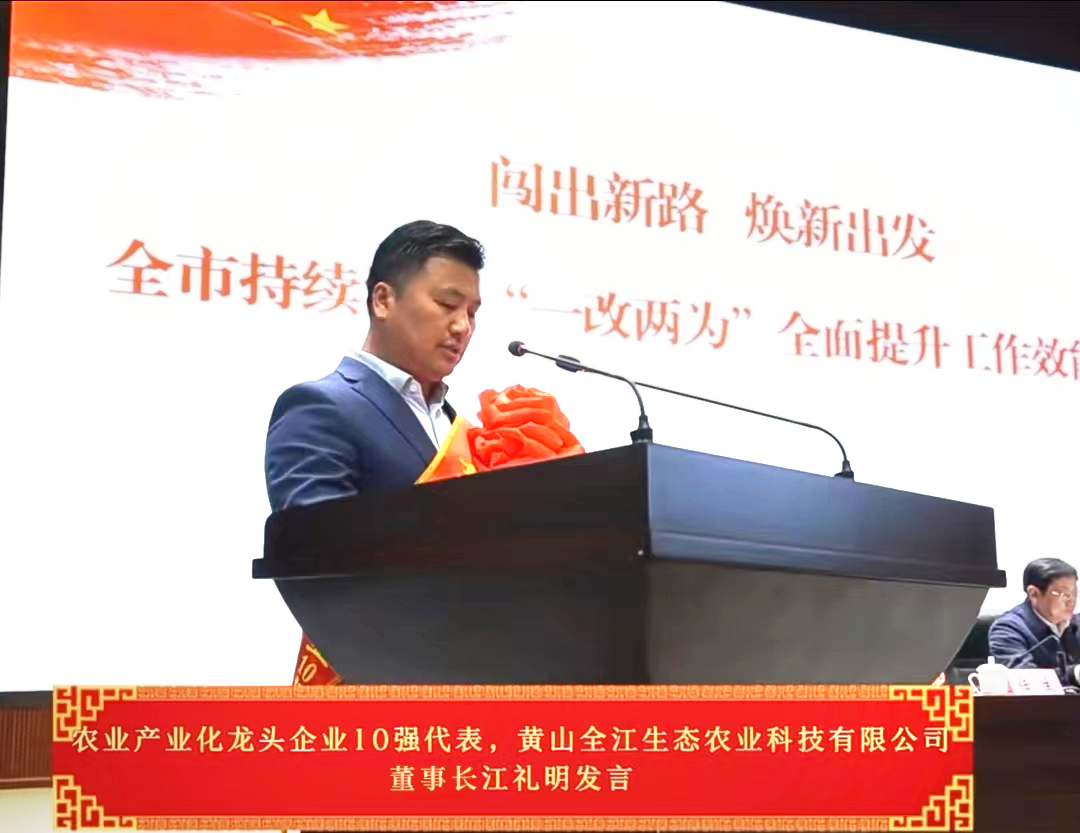 会议通报表扬了2022年度全市优秀企业,黄山全江生态农业科技有限公司荣获“黄山市农业产业化龙头企业10强”荣誉称号。董事长江礼明作为优秀企业代表出席会议并上台接受授牌。
