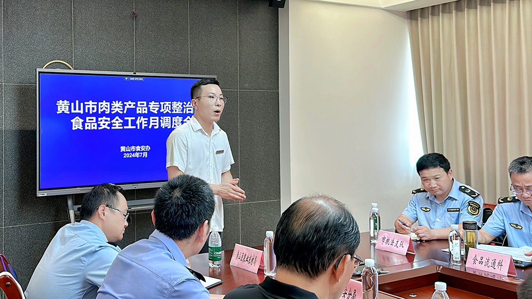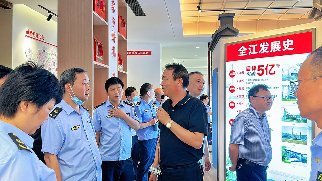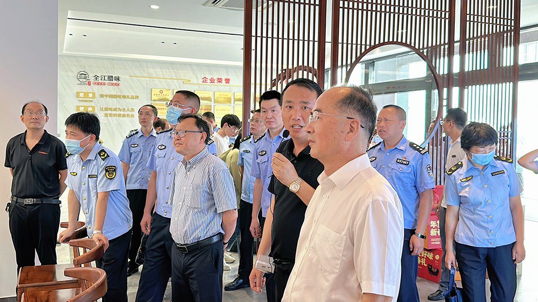 7月9日上午,黄山市黄山区食品安全委员会办公室、黄山市公安局黄山分局、黄山市黄山区农业农村水利局、市场监督管理局领导一行莅临我司进行检查指导工作,全江腊味总经理胡国峰、品管部经理包琦栋及相关负责人陪同。