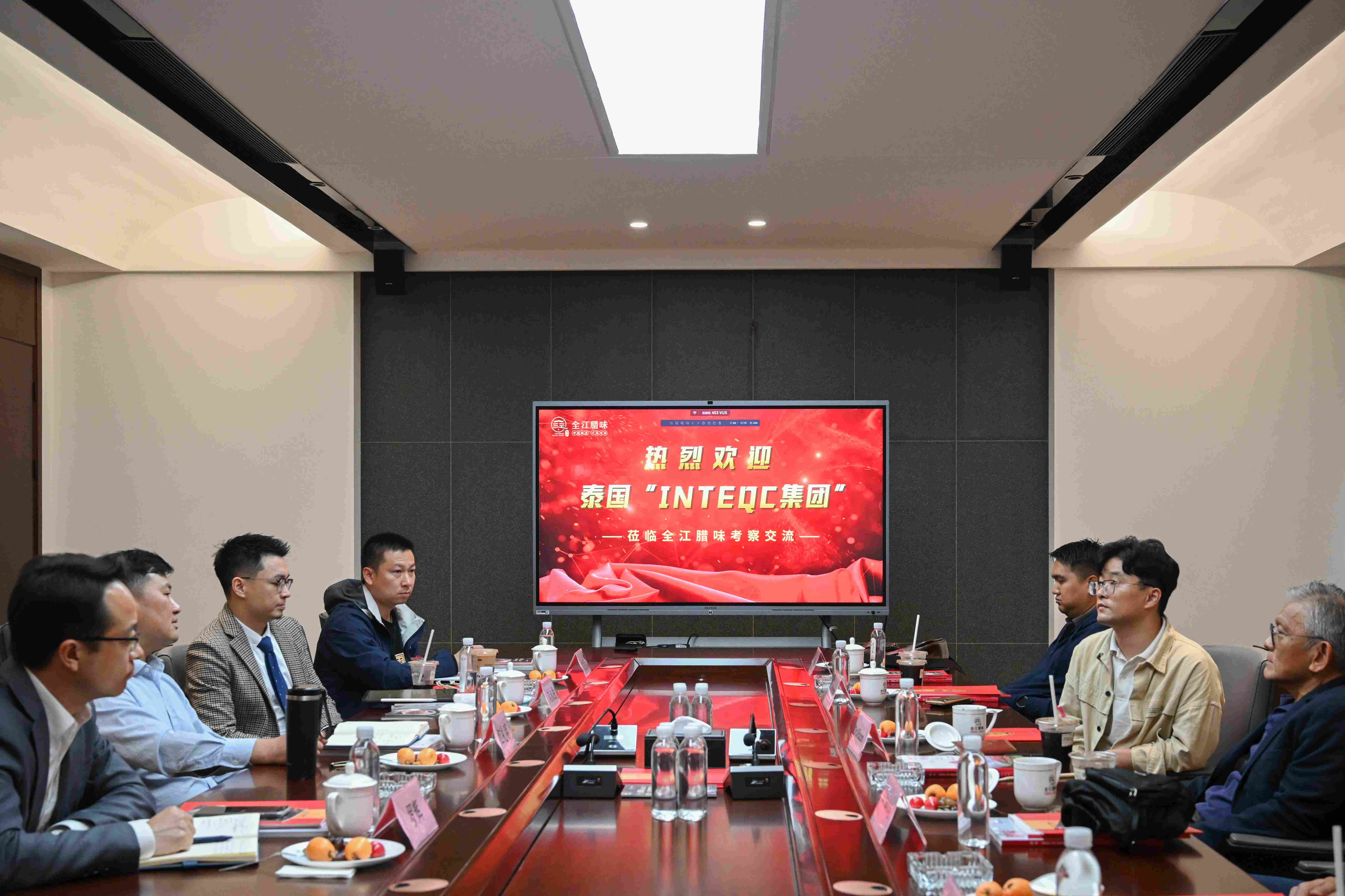 4月13日上午,泰国INTEQC集团创始人、董事长DR.Wiboon 先生、INTEQC 集团工程部负责人Mr.Peechanon先生以及食品部门工程师Mr.Samrong先生和Mr,Jetnipat先生一行到访全江腊味进行考察交流,全江腊味董事长江礼明先生率领公司相关负责人进行了接待。