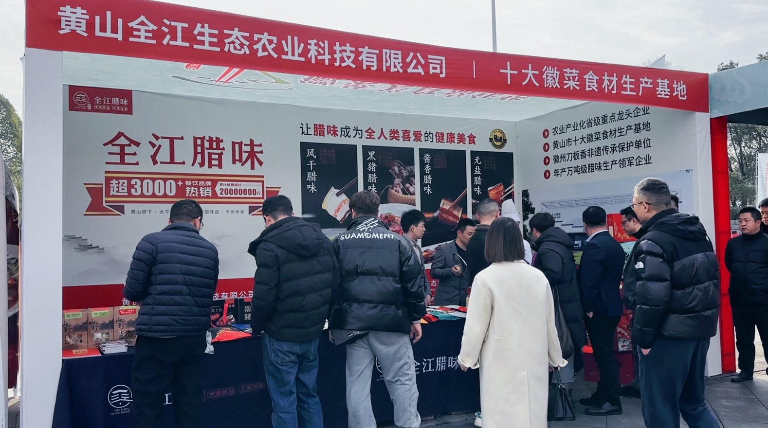 本次展会现场,全江腊味以其独特的展示方式和丰富的口感体验,吸引了众多参会者的目光。展区现场,人头攒动,全江腊味的展位前更是排起了长龙。参会者们纷纷品尝腊味美食,对其赞不绝口。全江腊味以其独特的风味,再次证明了徽菜的魅力。
