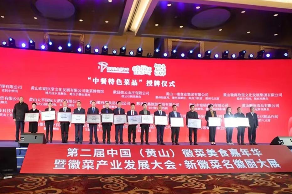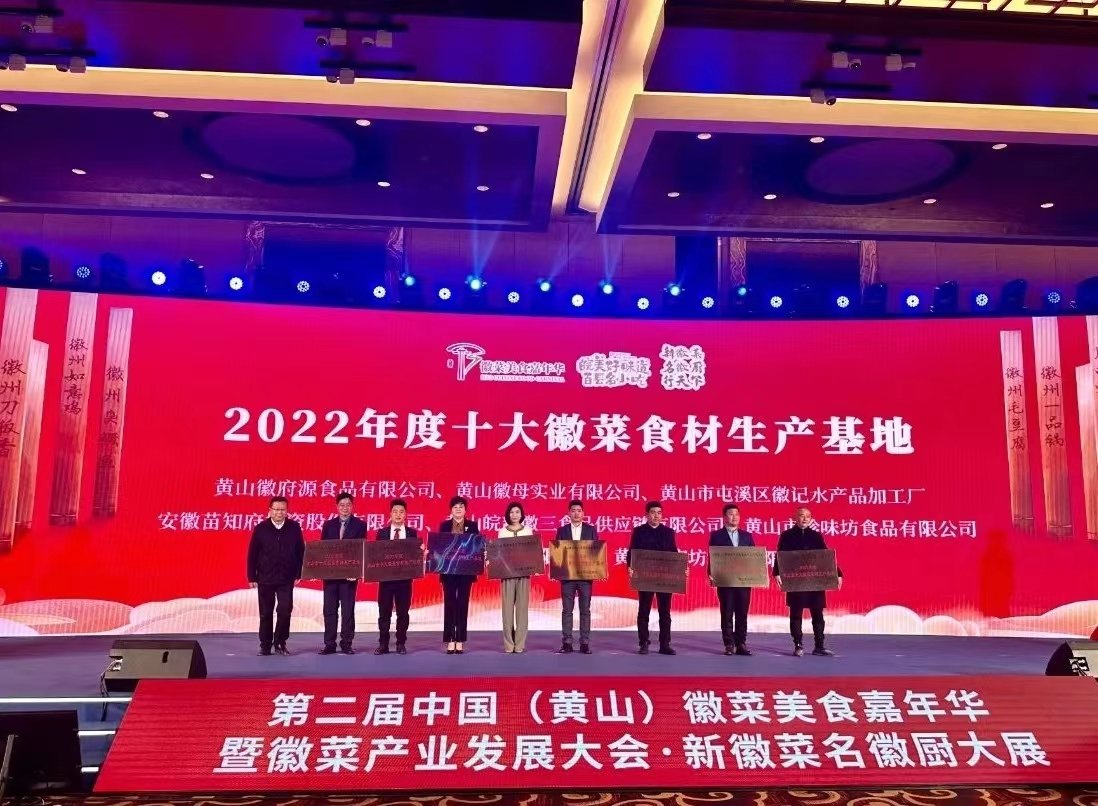 大会现场,依次对2022年度黄山名厨、徽菜行业领军人物、十大徽菜名店和徽菜食材生产基地进行了授牌、颁证。其中黄山全江生态农业科技有限公司荣获“2022年度十大徽菜食材生产基地”称号,董事长江礼明上台接受授牌。同时,全江刀板香和土香肠分别被列入中餐特色菜品名录。