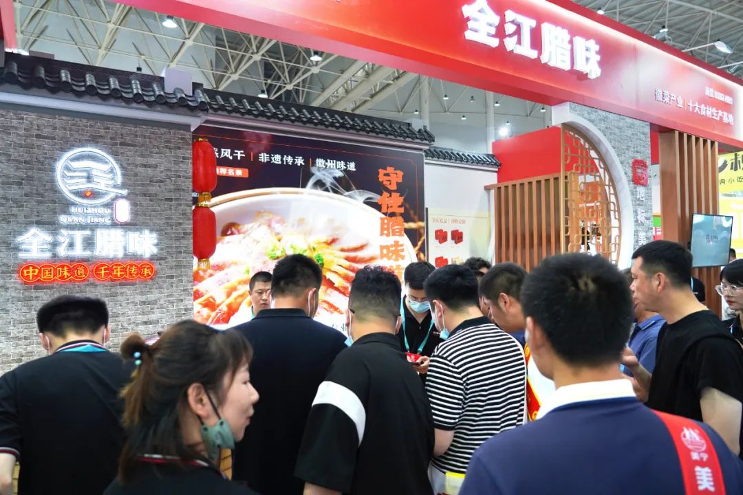 黄山全江腊味作为安徽黄山地标食材领军企业品牌,携团队近二十余人、携带几十种新品、爆品传统腊味食材再次亮相展会。如同往年的徽式布局,传统的徽派马头墙、一层层悬挂着的徽州刀板香、土香肠、酱肉和风干老鸡等产品,蒸笼里热气腾腾的醇厚腊香味,频频吸引客户驻足咨询。销售人员将产品的特色卖点娓娓道来、耐心讲解。用品质说话,让大家现场品鉴,用美味征服他们的味蕾。