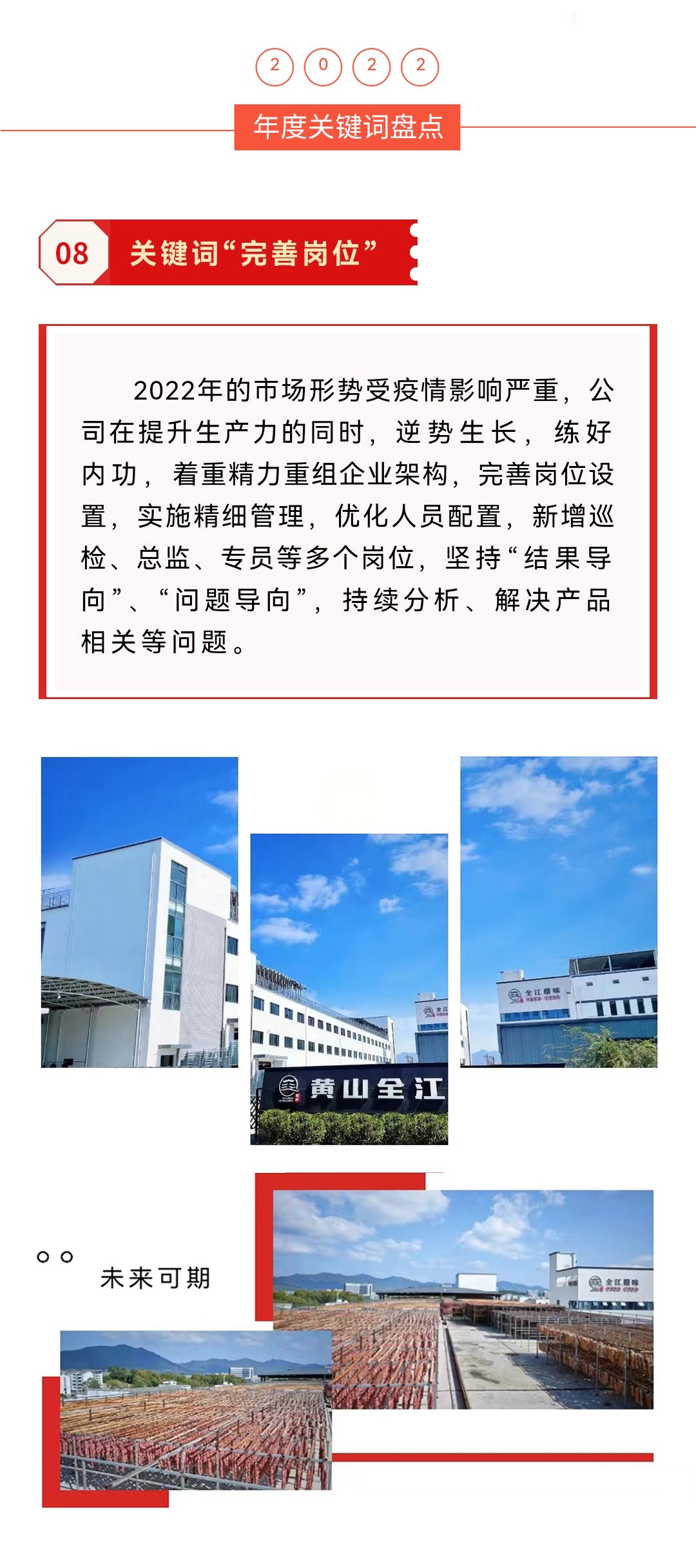 四季更替,光阴荏苒,细数2022年的历程,“疫情”一词继续刷了一整年的屏。黄山全江公司面临一系列的市场行情压力,从容面对与克服。此刻,盘点着旧年的年度关键词,浓缩着黄山全江腊味砥砺奋斗的2022,记录着这一年的收获和成果,也规划着新一年的追求与向往。