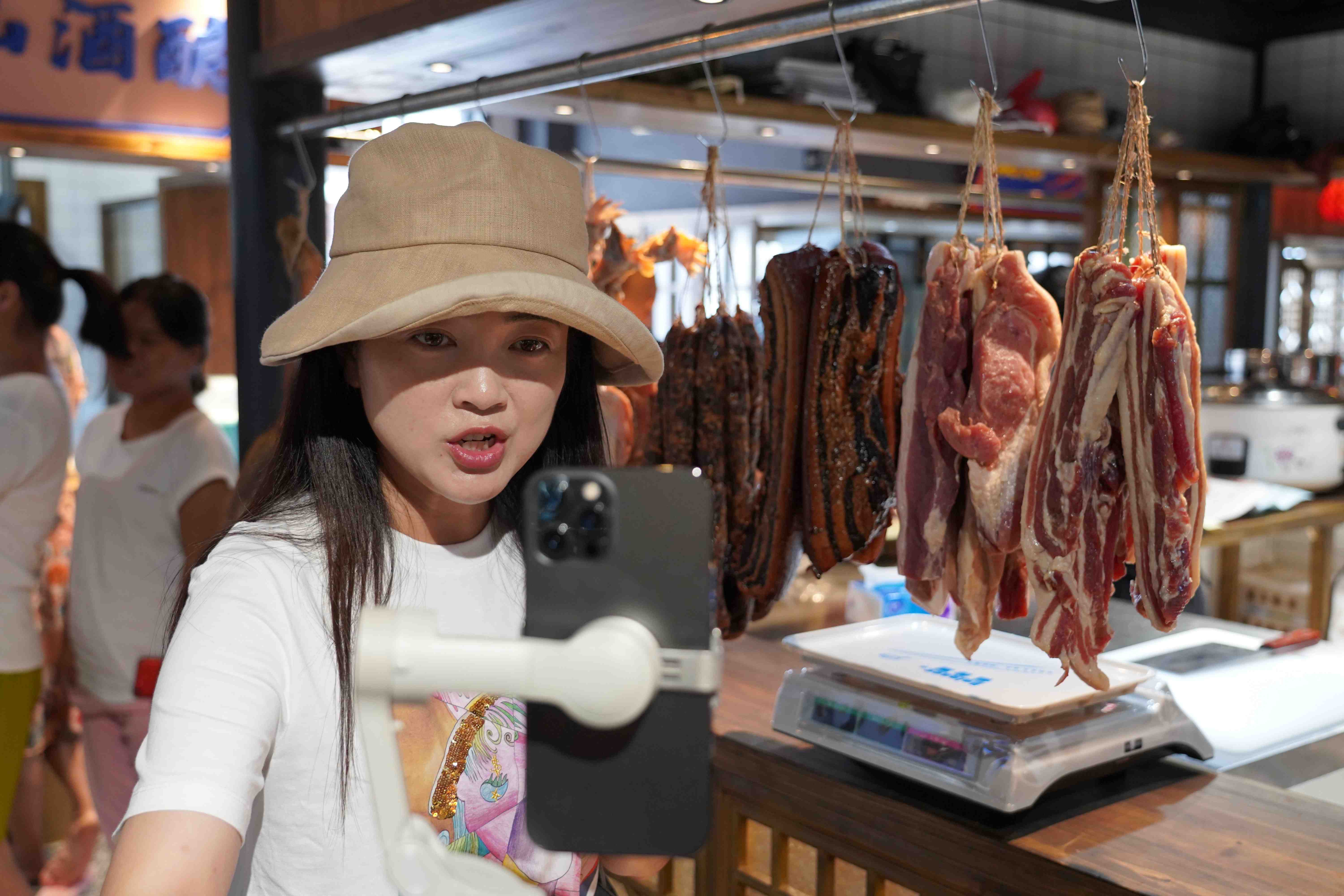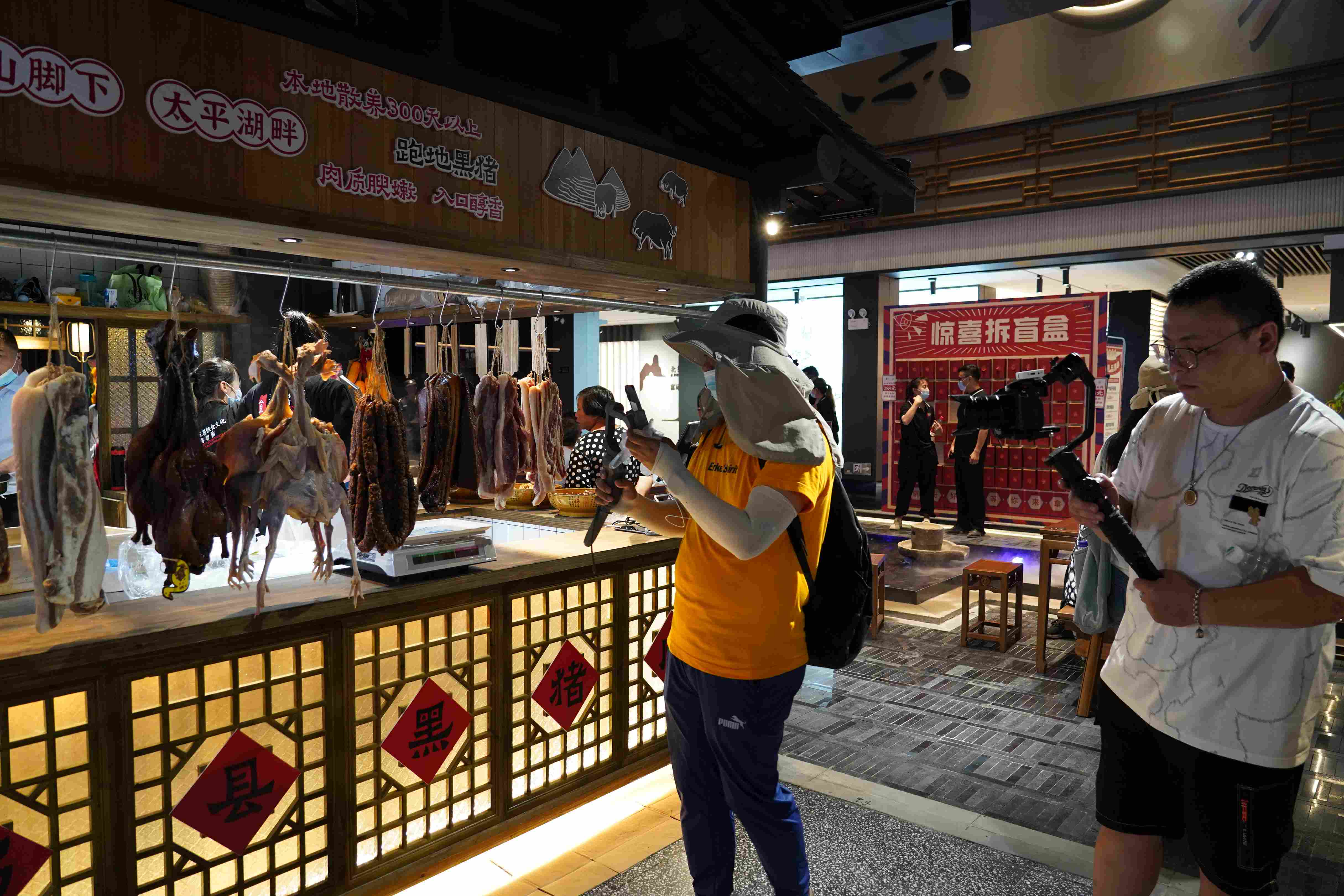 在人群中出现众多网红主播在全江腊味体验馆前直播,向直播粉丝介绍全江的传统徽州腊味,围绕皖南黑猪,聚焦徽州腊味背后的文化渊源,并向工作人员咨询直播带货的相关合作事宜。