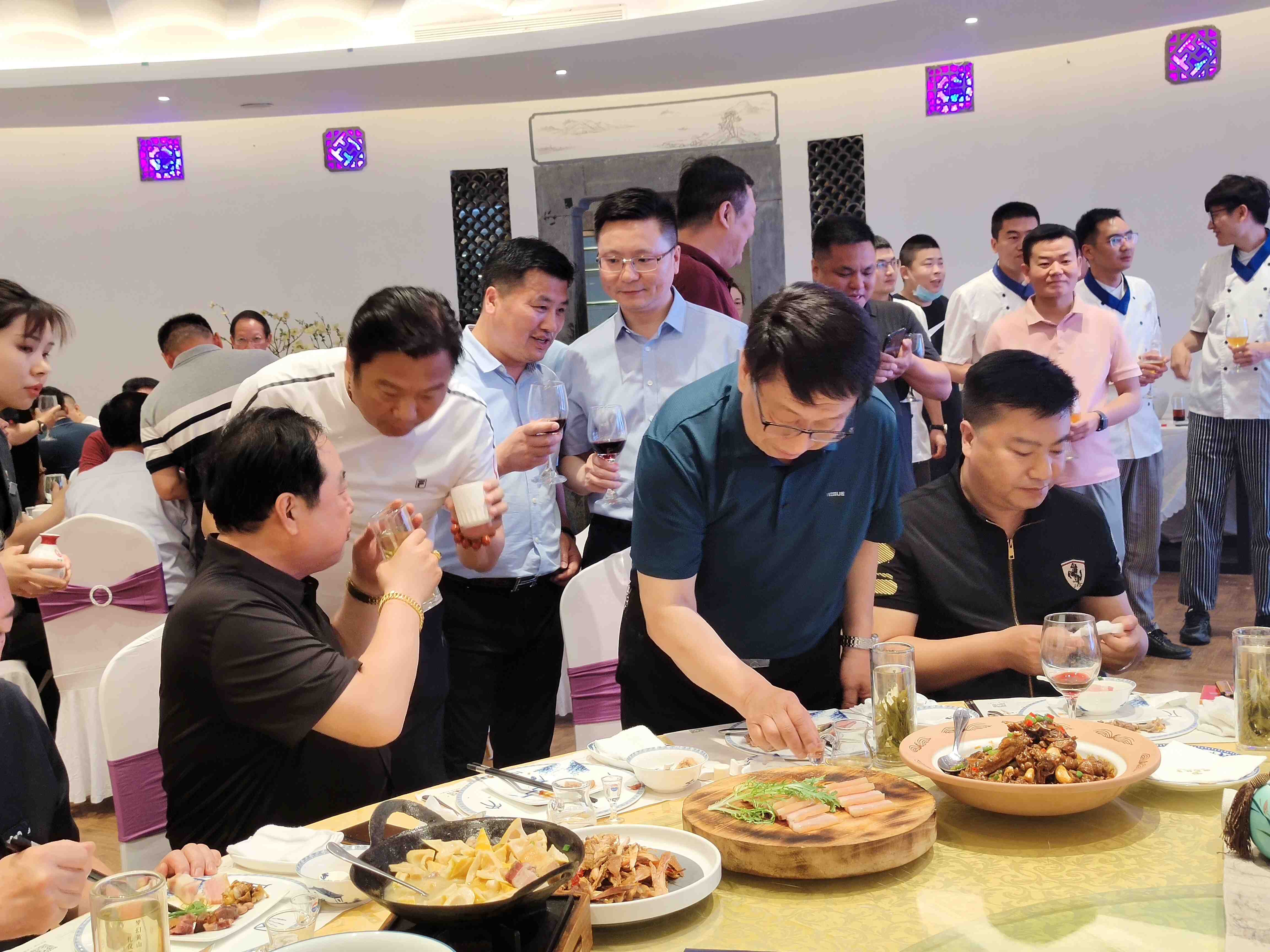 徽州腊味天津品鉴会的举办,全程的筹划和推进得到了津菜泰斗、元老级注册烹饪大师 赵嘉祥大师和赵师门同仁的全力支持,赵嘉祥大师在品鉴晚宴上用一首改编的黄梅戏开场致以精彩的致辞,阐述了天津和安徽的文化渊源,追溯至明成祖朱棣迁都北京和清李鸿章在天津时期等主要历史时期,徽菜对津菜的影响和融合。对晚宴上全江腊味的传统腊味产品给予很高的评价,他说“业内精英齐赏材、各个点赞徽食材”,尤其是刀板香、酱香黑猪肉和农家土香肠,赵嘉祥大师认为完全可以借鉴徽菜的“以味调味、原汁原味”的烹饪特点,将这些食材和天津菜充分创新和融合,带给天津餐饮业新的菜品呈现形态。赵嘉祥大师,希望徽津两地多加强交流、互动,多进行厨艺和食材的研讨,并表示将计划率天津餐饮界同仁莅临黄山进行徽文化考察和食材采风调研。