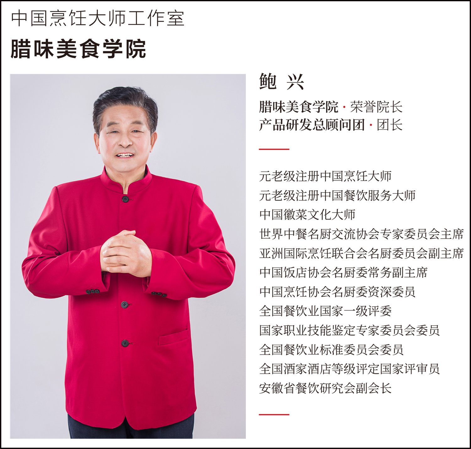 鲍兴大师为黄山全江 产品研发总顾问、腊味美食学院院长,获得的荣誉有:元老级注册中国烹饪大师、元老级注册中国餐饮服务大师、鲍兴中国烹饪大师工作室、中国烹饪协会烹饪大师匠传委员会 副主席、新中国成立70周年全国饭店餐饮业功勋人物、中国餐饮30年功勋人物奖、安徽餐饮业终身贡献奖。