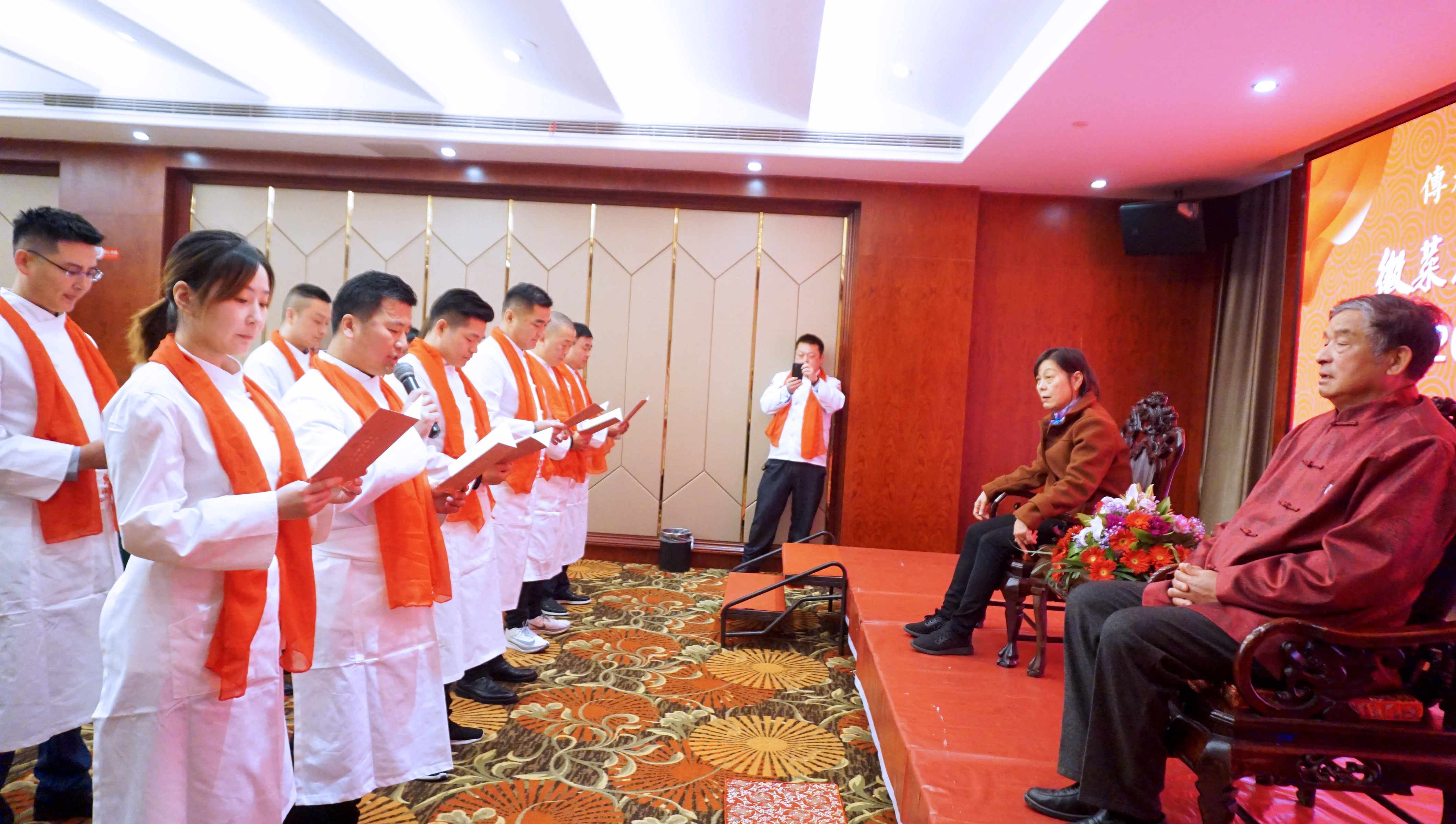 在拜师现场,一系列仪式传统而隆重。在同门师兄的见证下,首先由三代徒弟全江公司董事长江礼明领头,带领三代四代徒弟,诵读拜师帖,表达入门意愿。随后所有弟子依次向师傅提交拜师帖、跪拜仪式、敬茶,师傅回礼,随后合影才算礼成。