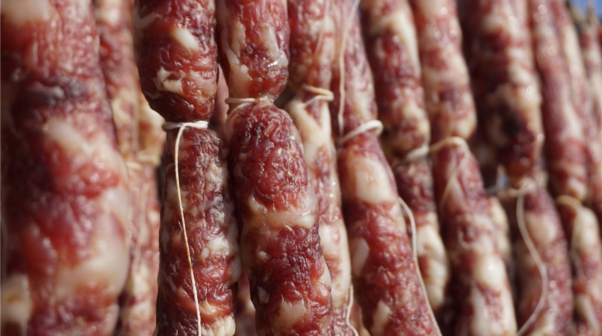 腊肠:又名香肠,肉搅碎再灌入肠衣、不加淀粉,可以长时间贮存,醇厚浓郁、回味无穷。