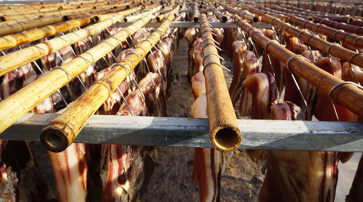 涂擦食盐的猪肉被放入木缸,密封放置于阴凉处。腌制一周后拿出挂晒、风干晒香;冬日风和阳光的力量,酝酿美味。
