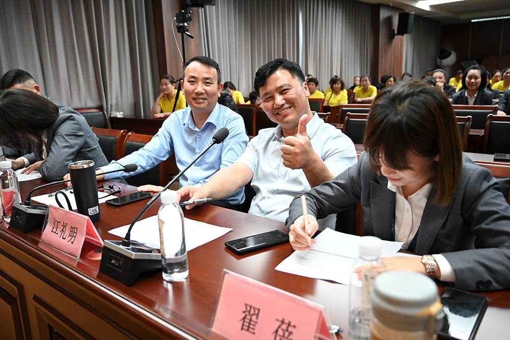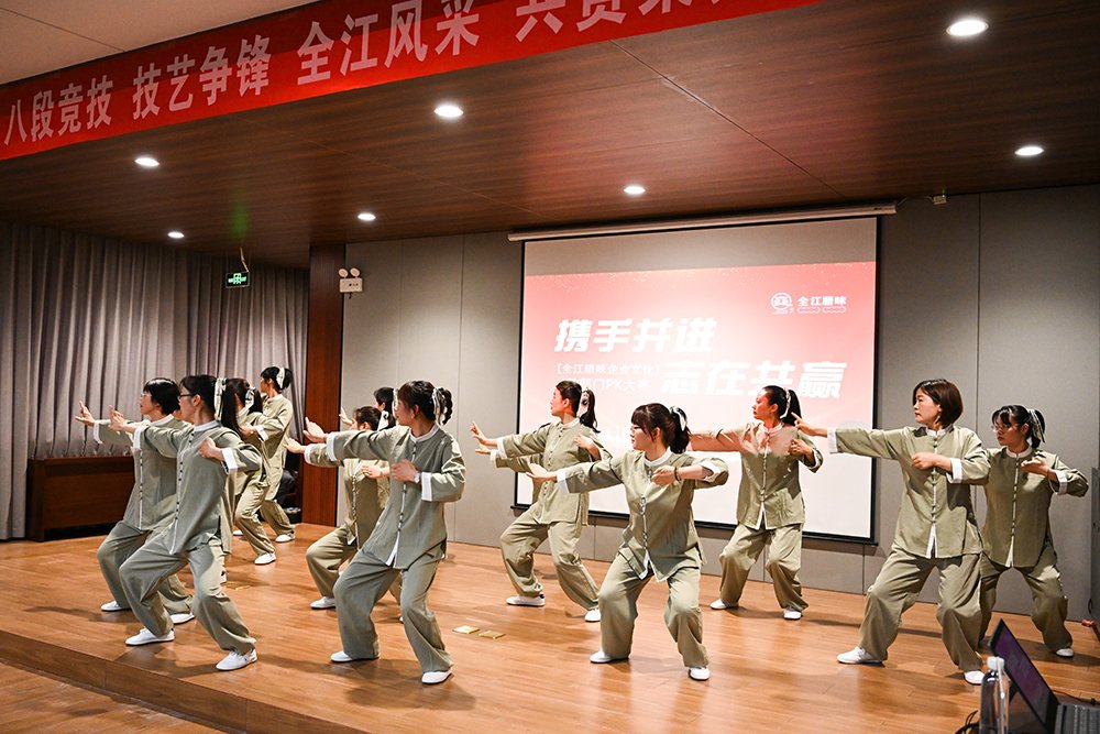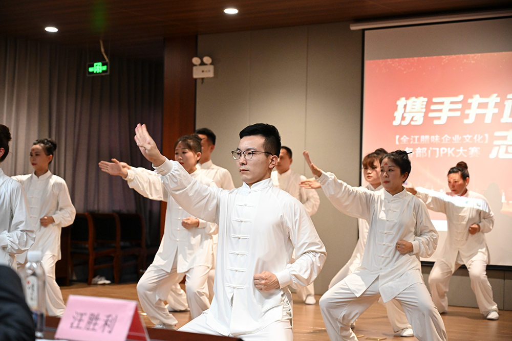 为宣传“六项精进”的企业文化思想,推行积极健康的工作生活方式,提升团队凝聚力,增强员工集体荣誉感与团队合作精神。4月22日,全江腊味在行政楼四楼活动室成功举办“全江腊味企业文化朗诵及八段锦部门PK大赛”,共有5个代表队近100名选手参赛。全江腊味董事长江礼明、总经理胡国峰、行政人事总监张雲、营销总监翟蓓、财务总监刘健、生产部经理翟玮、包装部经理钱桂枝、配料部经理汪胜利以及品管部主管包琦栋担任此次评委,其中全江腊味董事长江礼明作动员讲话。